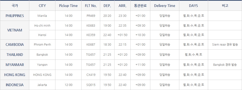 ※ 1. 상기 Pickup Time은 방문접수 기준입니다(사무실 마감은 동남아 및 기타지역은 16:00이며, 중국지역은 24:00 입니다.)